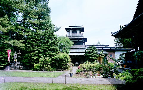 | ●阿弥陀堂と周辺 三階建ての建物が阿弥陀堂です。 屋根には鳳凰、三階の軒下には 「韋駄天」の扁額がかかげられ ています。韋駄天様はこのお堂 に奉安されています |