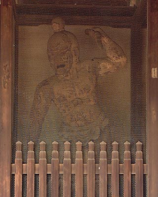 | ●仁王像 この仁王像二体は、平安時代後期(12世紀後半頃)の作で、世田谷区内に現存する仏 像の中でも最古のものに属し、美術的にも高く評価されています。 向って右を阿形(あぎょう)像=金剛力士、左を吽形(うんぎょう)像=密迹力士と 称し、像高は 270数cm、忿怒形ながら穏やかな表情、筋肉の盛り上がりをあまり強 調しない、なだらかな肉どり、簡素な衣文(えもん=衣装のひだやしわの表現のこと) など、平安後期の作風を示し、作柄に地方的なくずれを認めず、中央(京都・奈良な いしその周辺)での製作と考えらています。 |